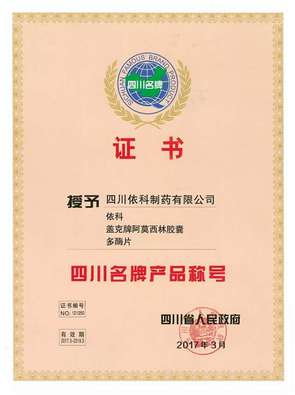 公司高度重视品牌战略,依法注册了“盖克”、“蜀中”、“三星堆”、“阿莫锋”、“益善源”、“蓉通”、“凯发k8官方网站登录”等108件注册商标,1999年“盖克”、2003年“蜀中”、2007年“三星堆”被认定为德阳市知名商标,2001年“盖克”、2004年“蜀中”被认定为四川省著名商标, 2008年“盖克”商标被国家工商行政管理总局认定为“中国驰名商标”。2017年3月,公司盖克牌、凯发k8官方网站登录牌阿莫西林胶囊和多酶片被四川省人民政府授予四川名牌产品称号。2016年,公司实现营业收入66373万元,利税7600万元;2017年,公司实现营业收入75045万元,利税7572万元。公司2017年被命名为德阳市第七批院士专家工作站,2016-2018连续三年被德阳市人民政府确定为重点龙头企业。